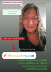 Und das Energetische hab ich mit einem Insta-Live mitlaufen lassen. Danke an Cathrin an dieser Stelle für ihre Pionier-Leistung Pharmazeutisches Coaching als Dienstleistung anzubieten. Ist ein tolles Gespräch geworden. Ein Workshop zum Thema “Stress-Management” hat den Auftakt für dieses Angebot gebildet. Für diese Kooperation habe ich eine Kurz-Meditation aufgenommen, 8 Minuten,